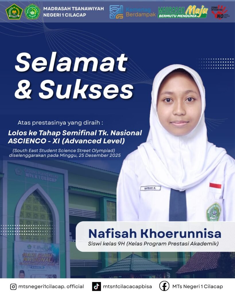 Menuju Madrasah Mendunia, Nafisah Khoerunnisa siswi Program Prestasi Akademik MTs Negeri 1 Cilacap melaju ke Tahap Semi Final ASCIENCO (South East Asia Student Science Street Olympiad) Tahun 2026